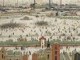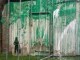Tall metal fencing is put up around the mural and tree after the artwork is strewn with paint.